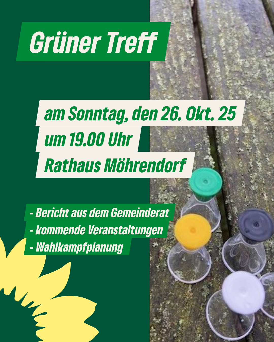 Grünes Ortsverbands-Treffen Unser regelmäßiges Arbeitstreffen umfasst anstehende Planungen für Veranstaltungen und ein Austausch zur Gemeinderatsarbeit. Auch Besucher sind willkommen. Das nächste Treffen findet am Sonntag, den 26. Oktober 2025, um 19.00 Uhr im Rathaus statt. Für Rückfragen vorab kontaktiere gerne karin.kreiner@gruene-erlangen-land.de oder Pauline.port@mnet-mail.de Sonntag26.10.202519:00 UhrRathausHauptstr. 16MöhrendorfDownload als ics-Datei